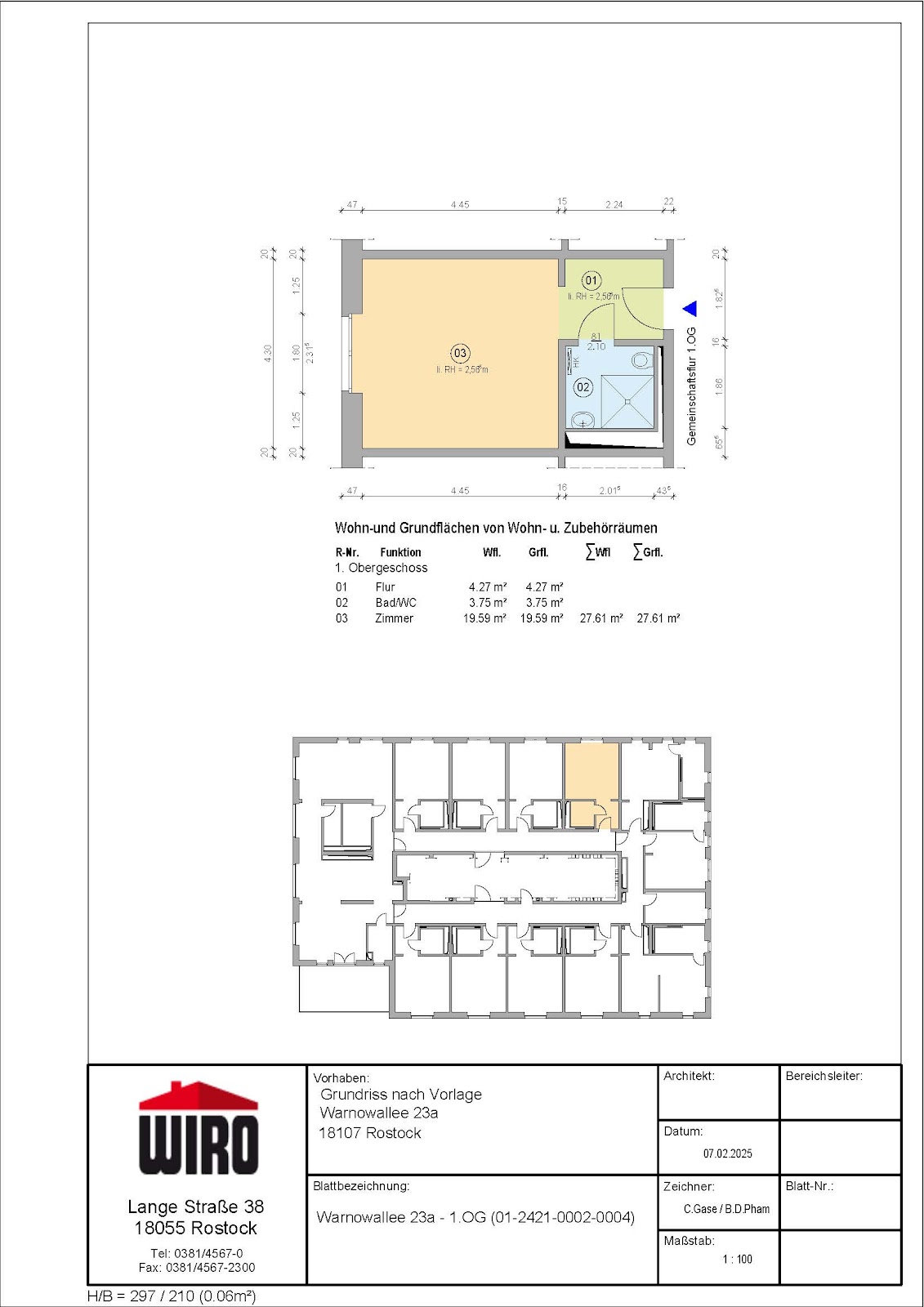 Ihr 1-Zimmer-Apartment hat eine Wohnfläche von 27,61 m². Der Anteil an der Gemeinschaftsfläche beträgt 19,55 m². Somit beläuft sich die angemietete Fläche auf 47,16 m².