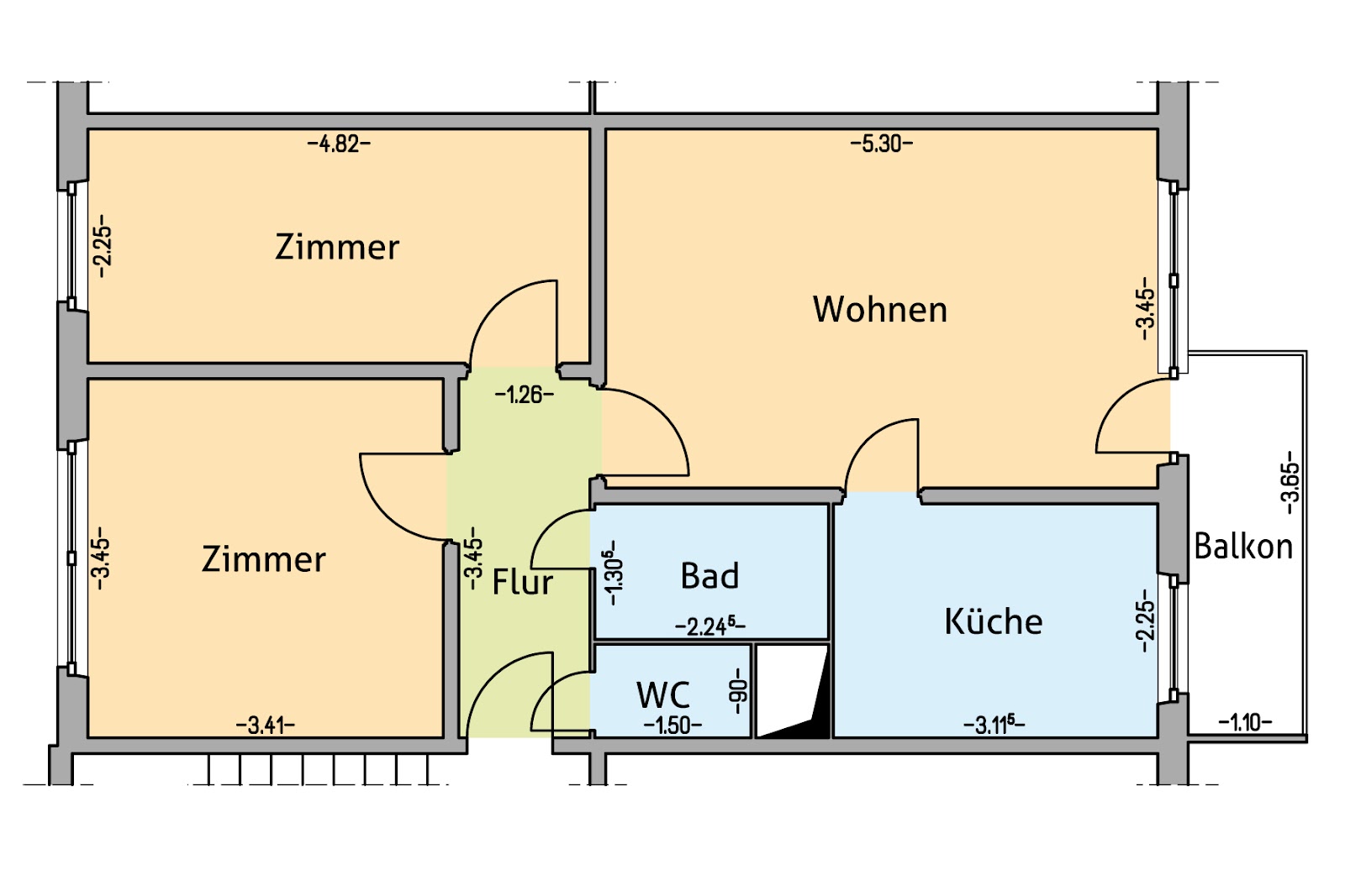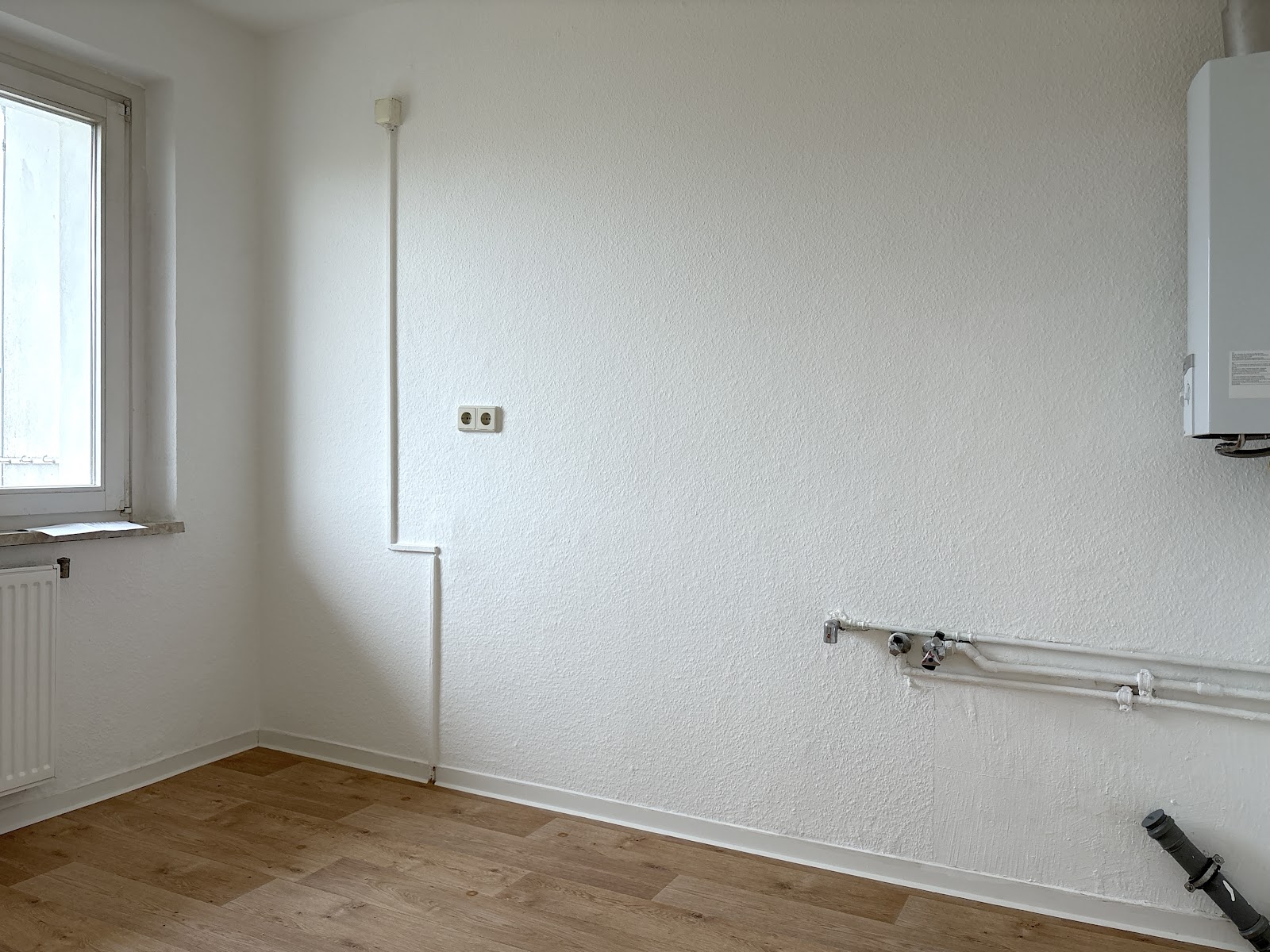 Die Wohnung befindet sich in einem guten und sauberen Zustand. Die Wände sind mit Raufaser tapeziert und weiß gestrichen. Der Fußboden hat einen PVC-Belag in Holzoptik. Die Innentüren sind weiß und wurden bereits erneuert. Vor der Übergabe überprüfen wir für Sie die elektrischen Leitungen und die Steckdosen.
